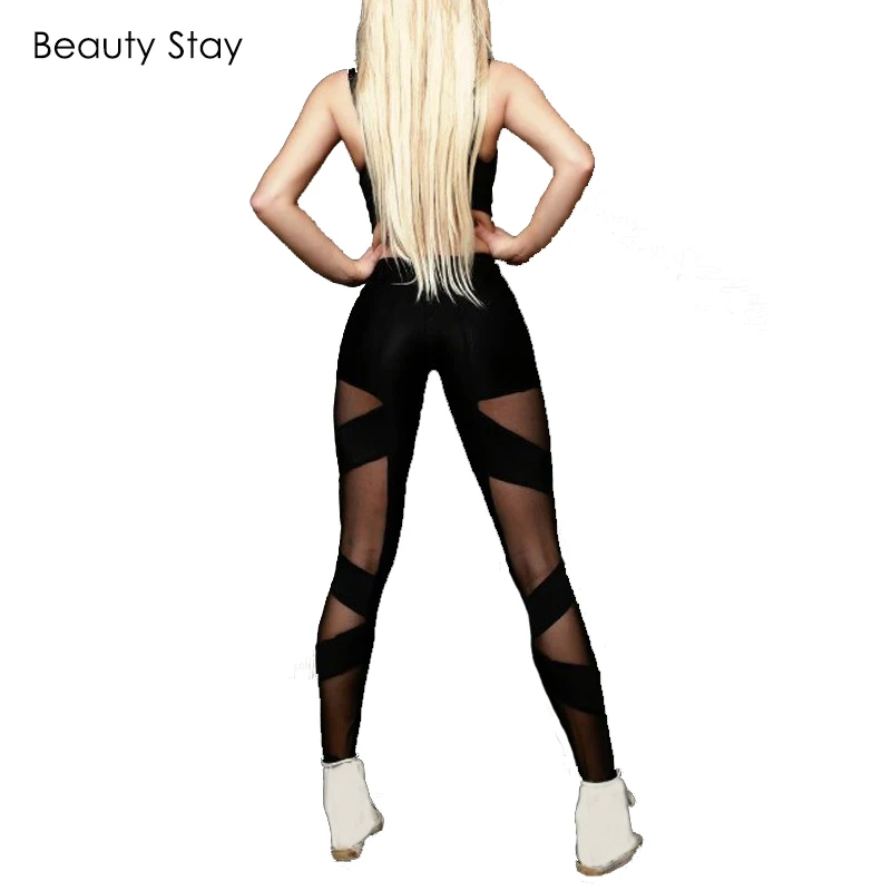 BeautyStay Sexy Cross Mesh Skinny Leggings Women Bandage Black Pants See Through Night Club Slim Tr