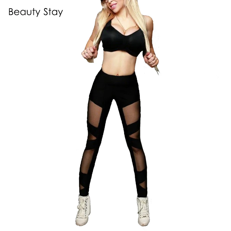 BEST QUALITY BeautyStay Sexy Cross Mesh Skinny Leggings Women Bandage Black Pants See Through Night Club Slim Tr