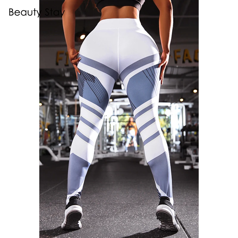 Beauty Stay Women Leggings Digital Print Stitching High-waist Black Polyester Ankle-Length Fitness